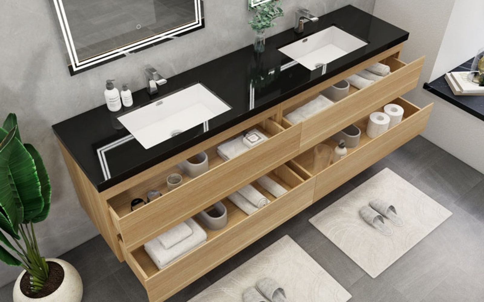 The first critical component of a Modern bathrooms is the crisp, clean lines and minimalistic aesthetics. A modern bathroom vanity's geometric shape, straight lines and sleek fixtures create a streamlined, clutter-free space. Opting in for simple, floating bathroom vanities with clean finishes, minimalist faucets, and unadorned mirrors to achieve a sleek and contemporary look.