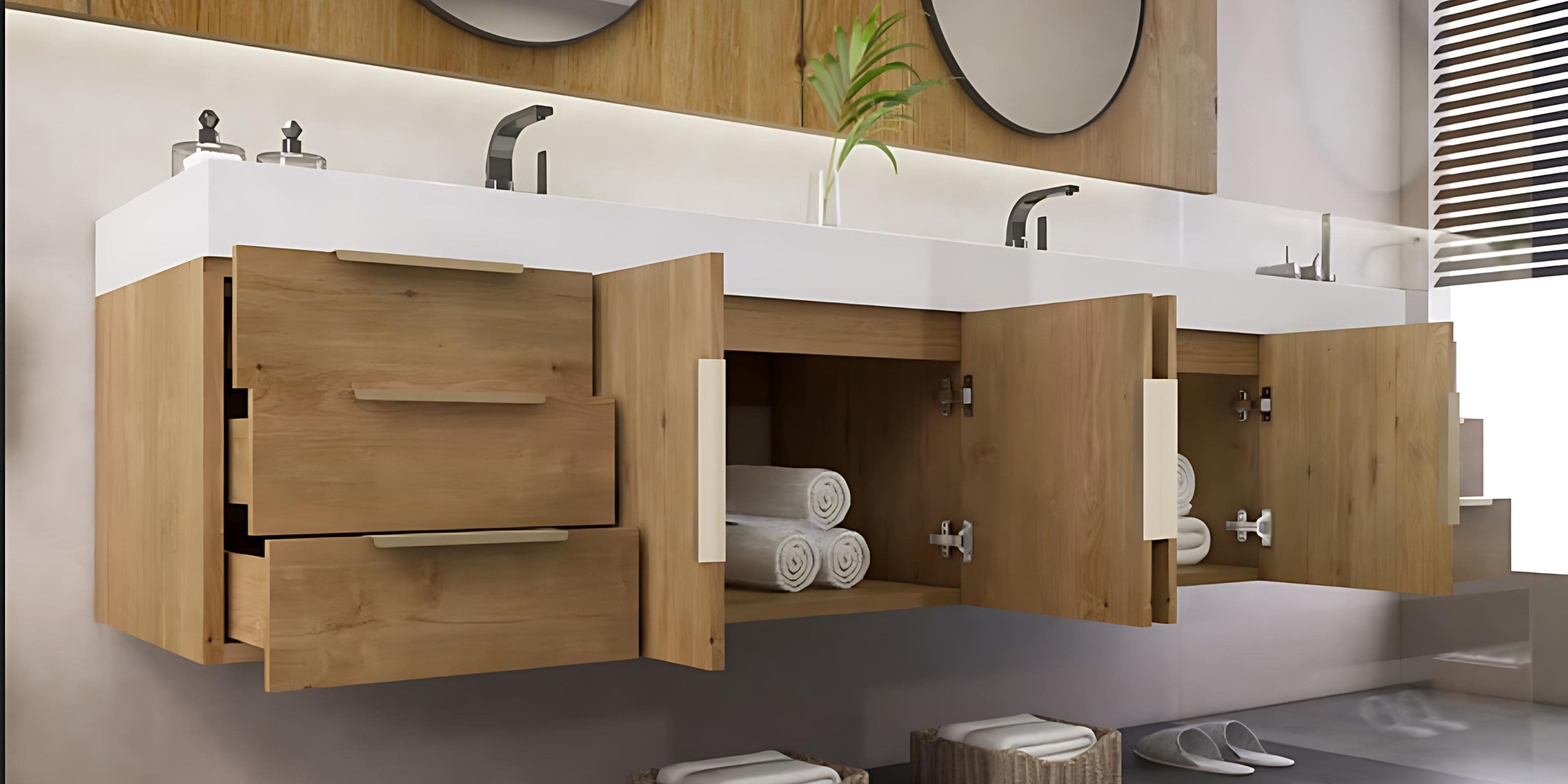 Newly released, this expansive double-sink model provides ample countertop space and storage. Wall-mounted design creates an open, modern look. Crafted from premium wood with sleek integrated sinks. Maximize your footprint with an 84" large floating vanity streamlined style.